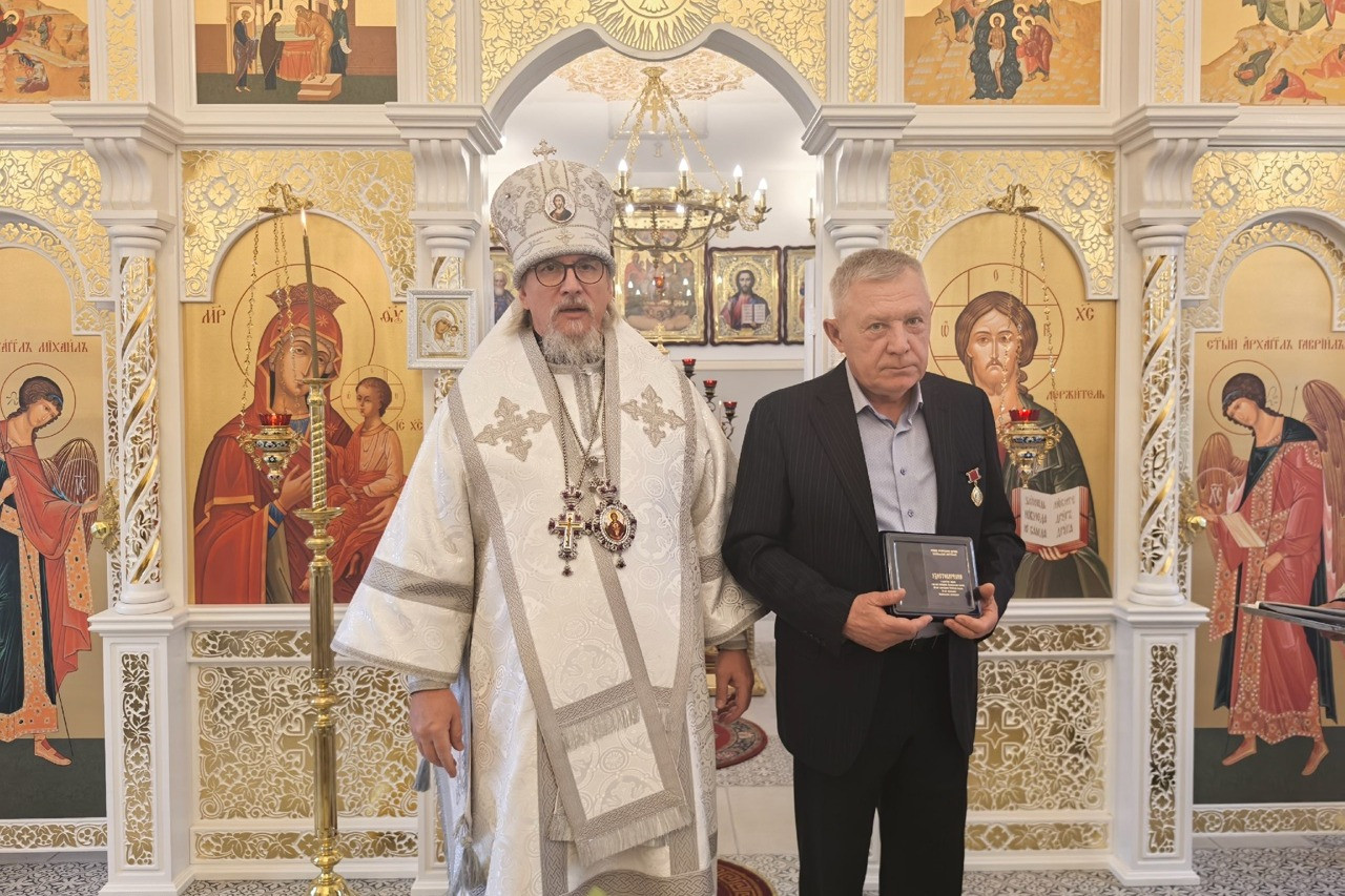 Затем состоялось вручение церковных наград, архипастырь отметил памятными юбилейными медалями, знаками и архиерейскими грамотами благотворителей и жертвователей храма.